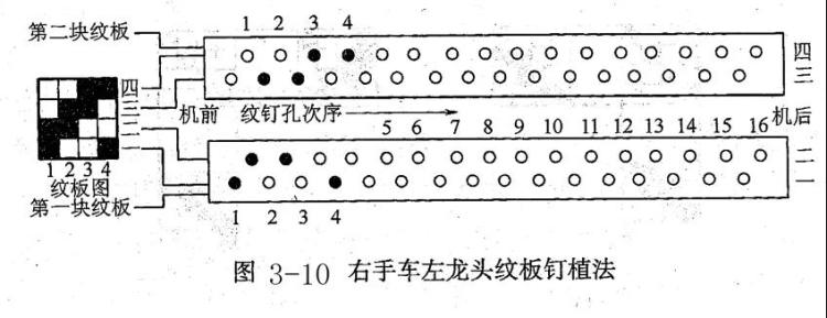 一块纹板上有两排纹钉孔,每排纹钉控制一次开口;每排各有16个孔眼,每个孔眼控制一页综片,尽量用靠近机前的孔眼(前综)。