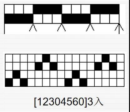 两横格,代表相邻筘齿。穿入同一筘齿的经纱涂以连续符号,穿入相邻筘齿的经纱在另一横行涂以连续符号。