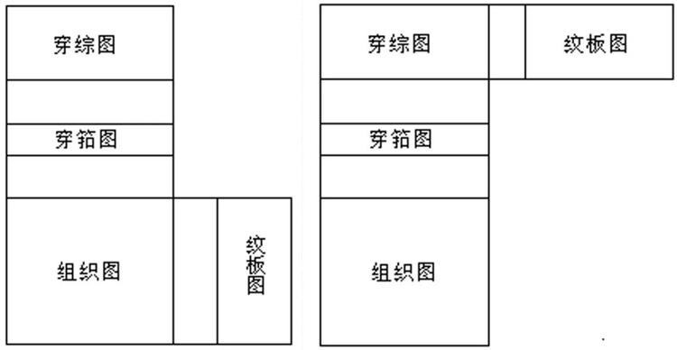 由组织图、穿筘图、穿综图、纹板图四部分组成,并按一定位置排列而成。