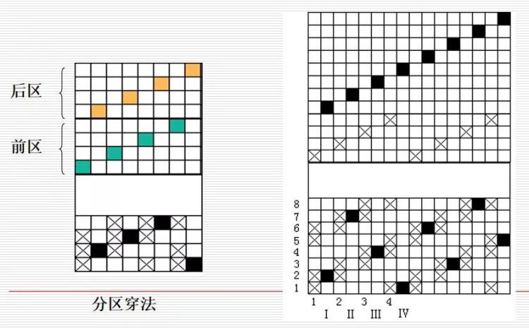 若组织中包含两个或两个以上不同组织,或不同性质的经纱织造时,采用分区穿法。一般把综框前后分区。