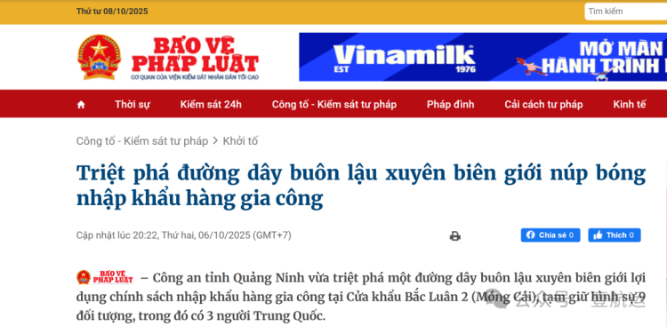 当地时间10月6日,越南司法检察机关发布官方公告,宣布捣毁了一个以进口加工货物为幌子的涉华跨境走私团伙。