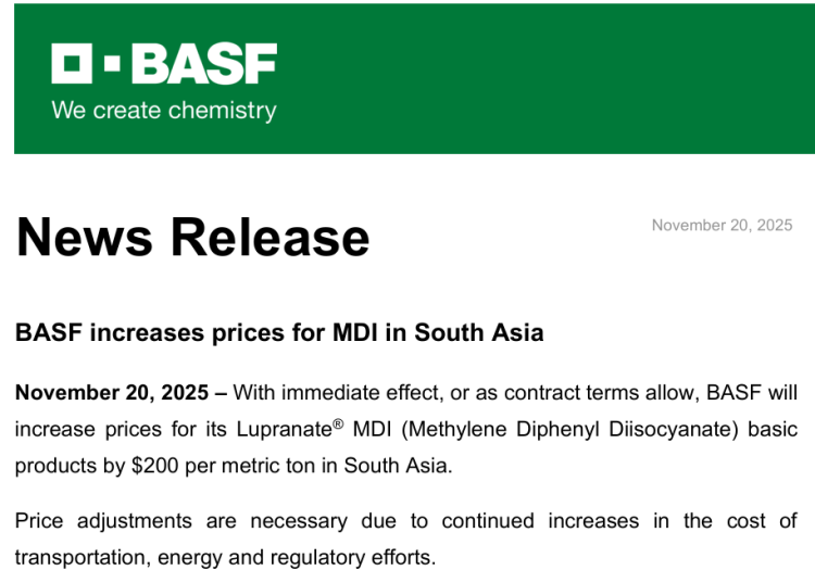 11月20日,巴斯夫宣布从即日起(或根据合同),将上调南亚地区Lupranate® MDI基础产品的价格,涨幅为200美元/吨。此次价格调整是基于运输成本、能源成本及合规管理成本的持续上涨而实施的必要措施。