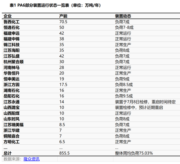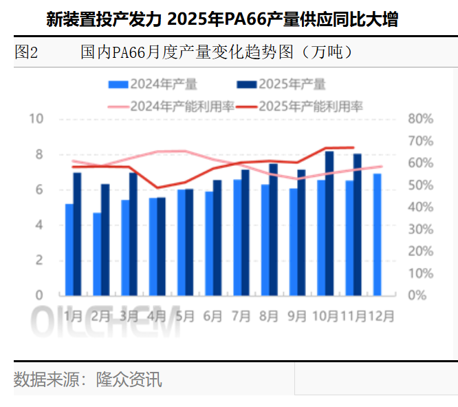 当前行业整体产能利用率约66%,处于年度偏高位置,但不同企业装置运行状态差异较大。高负荷运行企业:江苏华洋基本满负荷生产,神马装置负荷8成左右,宁夏瑞泰、天辰齐翔等保持正常运行。中等负荷企业:上海英威达、华峰、烟台华润等装置负荷在6-6.5成区间。低负荷/停车企业:优纤科技、唐山中浩、浙江新力等负荷整体偏低。