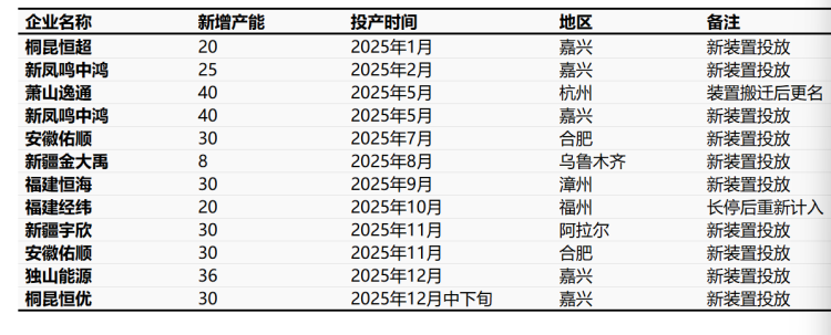 从主要投产地区来看,2025年江浙两省涤纶长丝新装置产能占比明显下滑,过去多年间,江浙两省一直是国内涤纶长丝新装置投产的主力地区,年内新增产能占比往往占到国内涤纶长丝新装置规模的80-100%,近年来,随着以桐昆为主的部分企业加大在福建、安徽等省份,以及新疆维吾尔自治区加快产能投放,使得多内涤纶长丝新兴产能投放地区产能规模不断增加。此外,嘉兴地区作为桐昆、新凤鸣两家聚酯龙头企业的地区,在2025年投产涤纶长丝总产能为151万吨,占据了全国总投产的半壁江山,这在一定程度上意味着行业集中度的进一步提高。