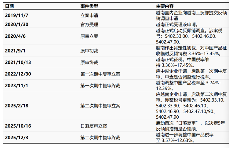 2025年12月3日,越南工贸部发布公告,对原产于中国的聚酯长丝纱线作出反倾销第二次期中复审终裁,决定将中国涉案产品的反倾销税调整为3.57%~12.63%。