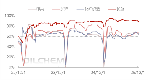 具体来看,根据隆众资讯统计数据显示,下游当前织造、加弹、印染开机率分别在63.7%、67.0%、62.8%,同比-1.9%、-11.2%、-2.4%。去年元旦假期后,下游织造、加弹、印染开机率分别下滑至55.4%、75.6%、55.6%,下游是在1月中旬(腊月十五后)集中走弱的,但今年春节假期较晚,2026年1月中旬尚处于农历十一月底,离小年都近一个月,下游放假同比去年或提前多一个到一个半月,需求预期进入1月将明显下滑。