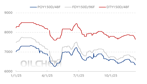 2025年,涤纶长丝年内价格低位在4月,其价格产生的原因是美国突然下达对等关税,致国际原油大跌,成本拖累下,涤纶长丝探底,其主流规格价格:POY150D/48F在6250,FDY150D/96在6475,DTY150D/48F在7600,聚合成本在5070附近。