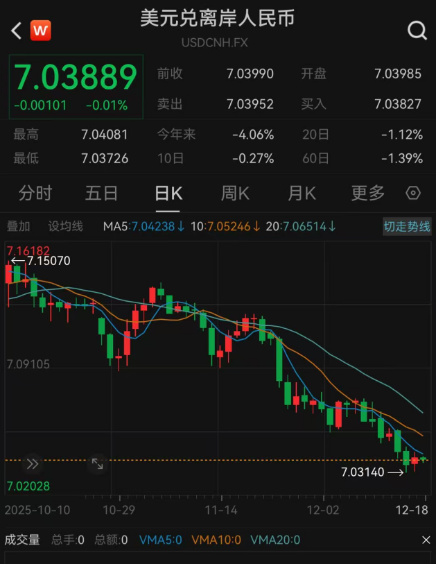 近期,人民币兑美元汇率持续走高,在岸、离岸频频创逾一年来新高。其中,美元兑离岸人民币汇率已击穿7.04关口,距离“6时代”只剩一步之遥。