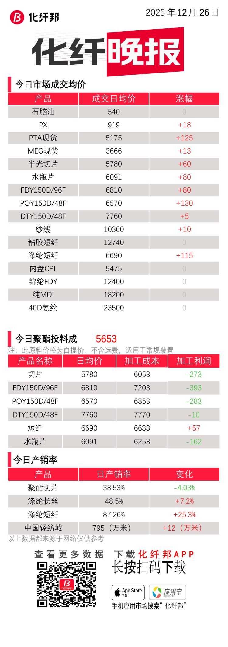 化纤晚报 | 12月26日 化纤相关产品的价格、产销、成本...