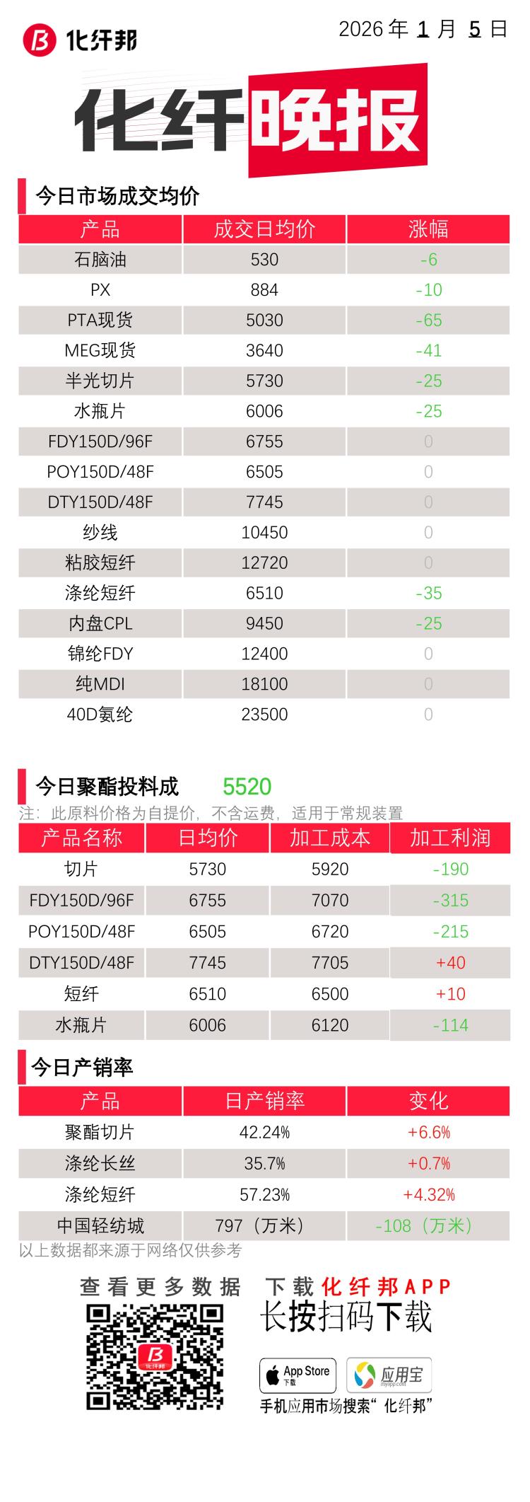 化纤晚报 | 1月5日 化纤相关产品的价格、产销、成本...