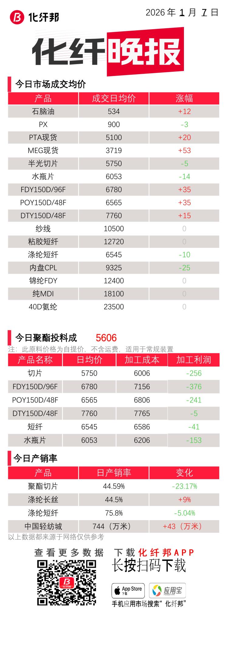 化纤晚报 | 1月7日 化纤相关产品的价格、产销、成本...