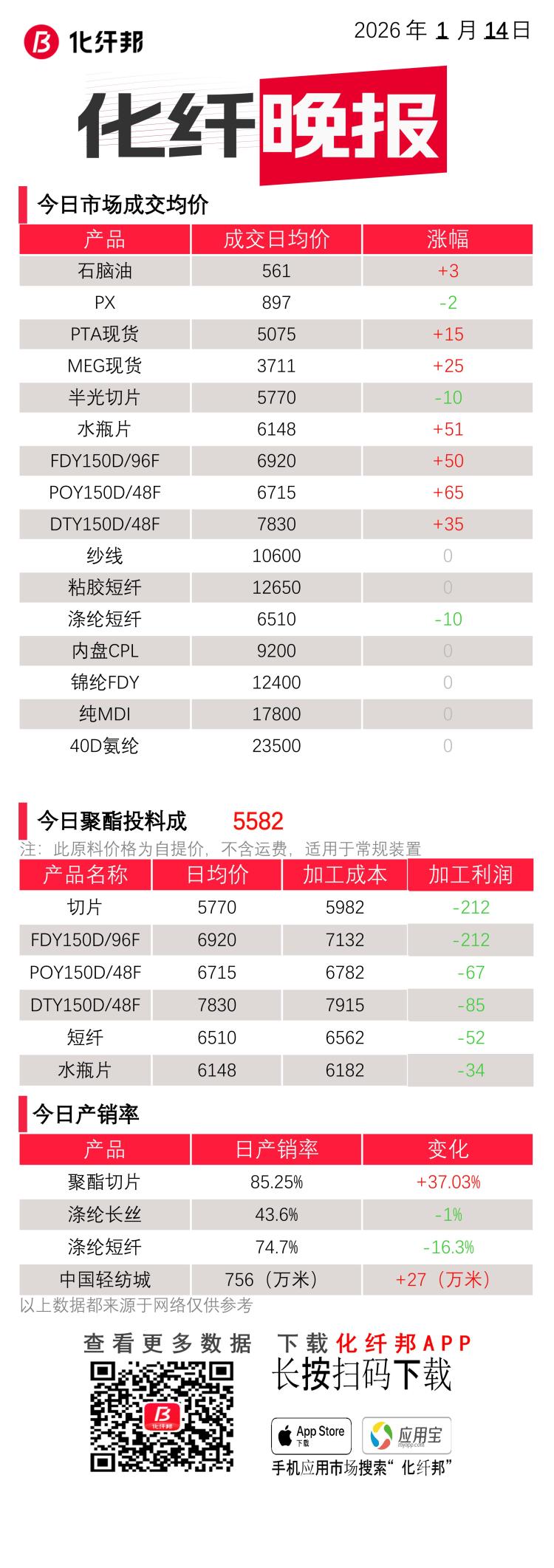 化纤晚报 | 1月14日 化纤相关产品的价格、产销、成本...