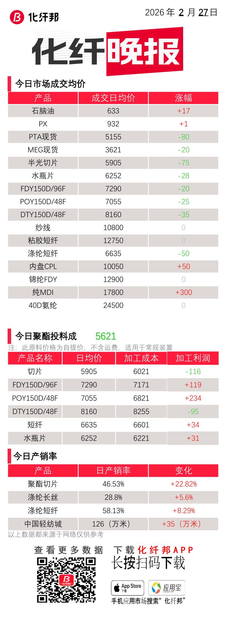 化纤晚报 | 2月27日 化纤相关产品的价格、产销、成本...