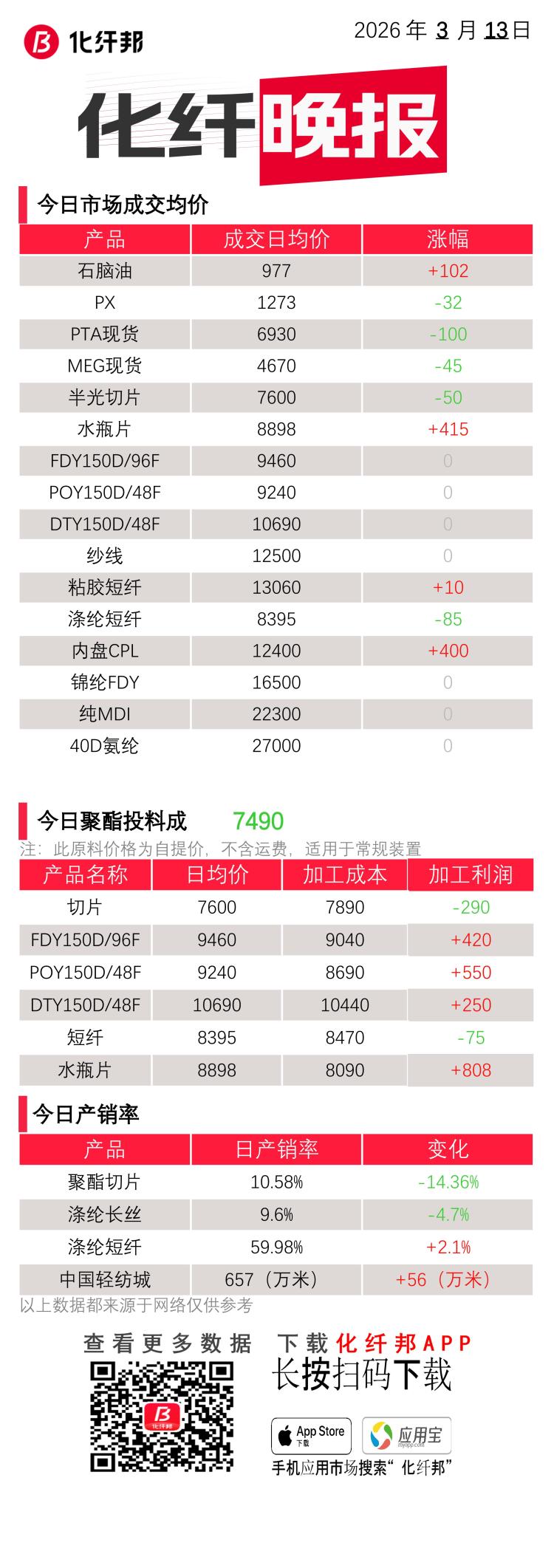 化纤晚报 | 3月13日 化纤相关产品的价格、产销、成本...