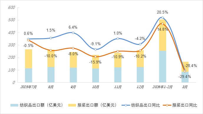 根据海关总署统计,3月当月,全国纺织品服装出口额为166.4亿美元,同比下降28.9%。其中,纺织品出口额为86.2亿美元,同比减少28.4%;服装出口额为80.1亿美元,同比下滑29.4%。