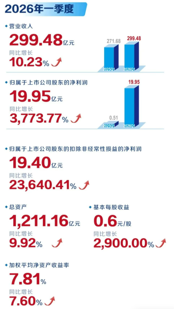 2026年一季度实现营业收入299.48亿元,同比增长10.23%;归母净利润19.95亿元,同比大增3,773.77%,扣非归母净利润19.40亿元,同比大增23,640.41%,业绩实现大幅增长。