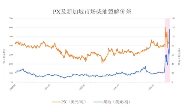 据了解,恒逸文莱炼厂一期的柴油产能为360万吨/年,PX产能为150万吨/年。2026年3月以来,新加坡市场成品油裂解价差迭创新高,其中柴油裂解价差最高达到178.22美元/桶的历史极值,实际销售时还有升水,PX产品的价差亦从400美金/吨上涨至最高600美金/吨。而在中东冲突前,柴油裂解价差仅在20-25美金/桶区间波动。“高价差+高升水”的组合,将文莱项目的效益推至历史最佳水平。